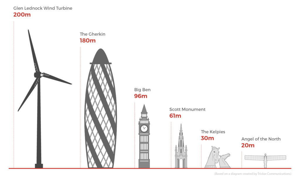 [1] The diagram below compares the height of Glen Lednock turbines with existing tall UK structures.
